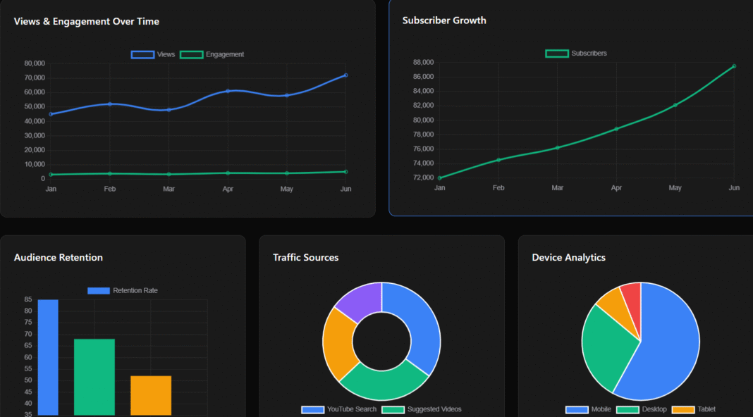 Analytics: Delivers comprehensive channel insights with detailed charts on views, performance, and growth trends.